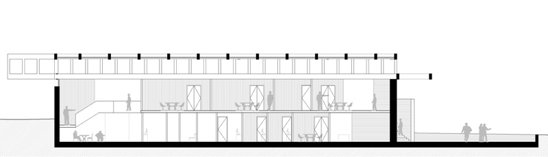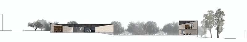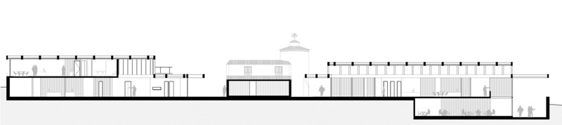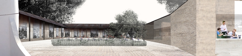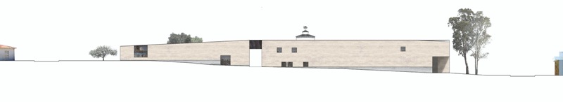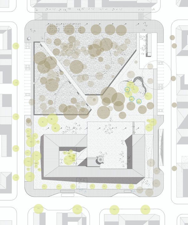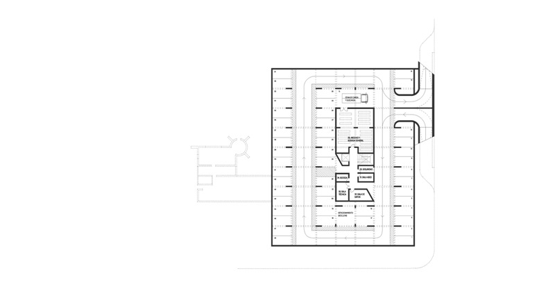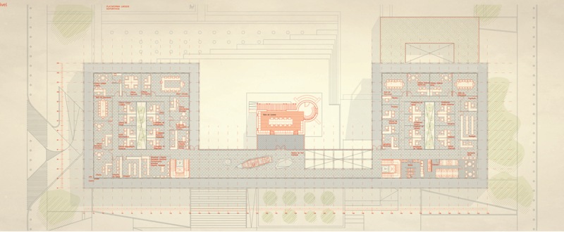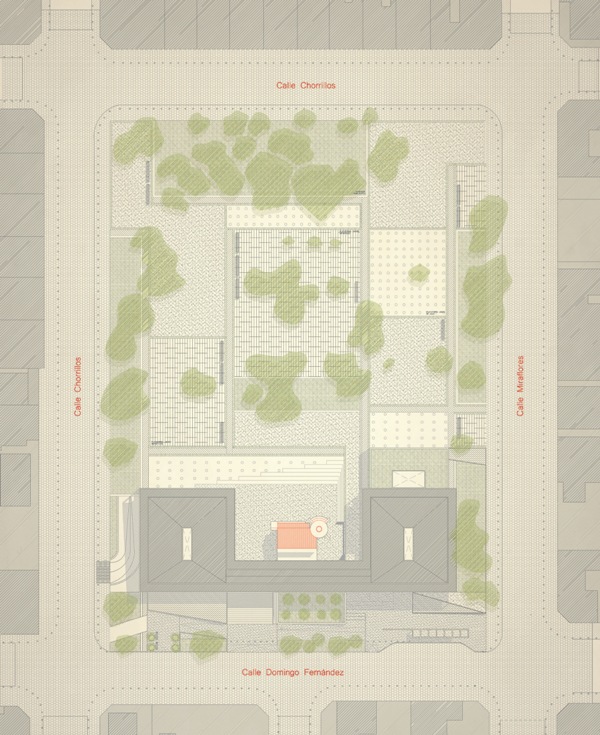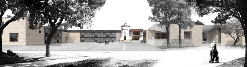 El edificio propuesto se extiende sobre los límites del área edificable para liberar el espacio central donde se acoge al edificio fundacional como elemento jerárquico en la distribución del conjunto. Los distanciamientos establecidos entre el edificio propuesto y el fundacional están determinados por los patios interiores que construyen el atrio como espacio de transición.
