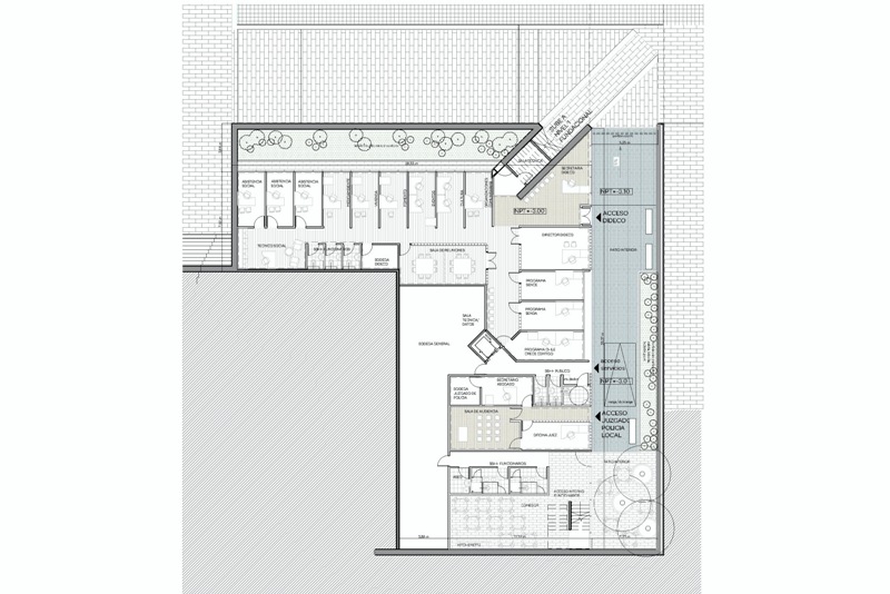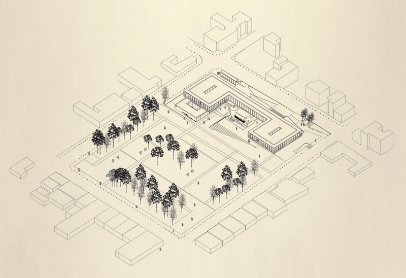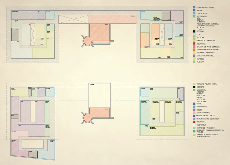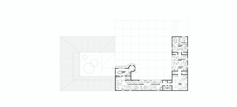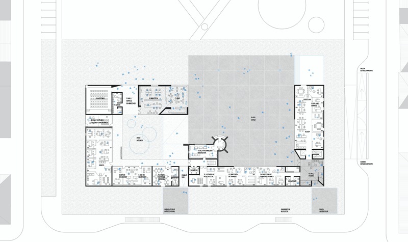 El emplazamiento del edificio construye dos espacios públicos; la gran plaza, un espacio cívico que articula el remate del parque con el edificio y el patio interior funcionando como una extensión informal del edificio público. El proyecto incorpora el parque generando traspasos desde los 4 lados, y los volúmenes emplazados para construir un marco visual hacia el noreste, así la plaza cívica puede consignar también como un acceso principal, constituyendo un espacio de carácter cívico inserto en el pulmón verde de la ciudad. Así el nuevo edificio se concibe como un detonador de nuevos actos, confluyendo entre el ejercicio cívico y la cotidianidad de la plaza.