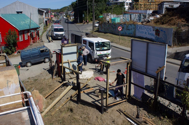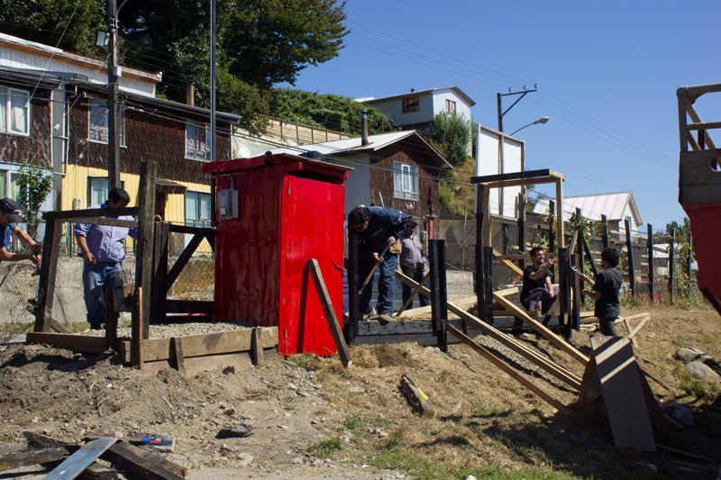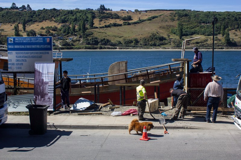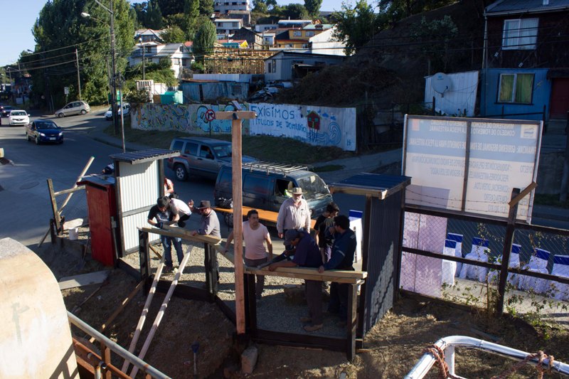 La idea del proyecto fue generar un espacio de descanso y contemplación aprovechando la apertura de la caleta de pescadores inserta en el barrio palafítico y al mismo tiempo dar un pequeño refugio a los pescadores y eventualmente un lugar de venta de sus productos frescos. Para desarrollar esta intervención se presentó el proyecto a los vecinos en un conversatorio abierto, con la asistencia de arquitectos locales, así como distintos actores interesados en la conservación y desarrollo de este barrio y en general en la valoración del patrimonio urbano chilote. Luego de dicha conversación se ejecutó la propuesta en 2 días de trabajo, tarea a la que acudieron carpinteros, pescadores, arquitectos y estudiantes en una experiencia de trabajo colectivo y de diseño en obra que culminó con una ceremonia de inauguración en pleno espacio público.