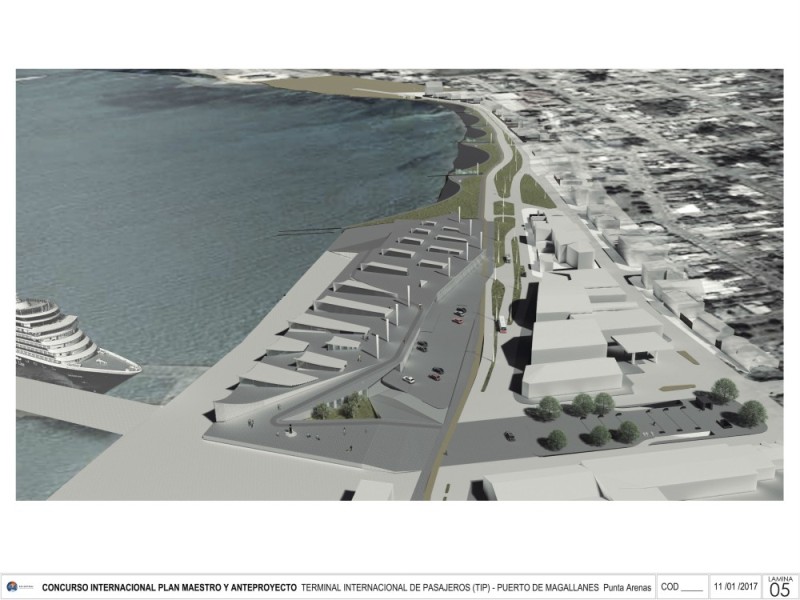 El nuevo Terminal Internacional de Pasajeros se propone como un edificio ligero y transparente, cubierto por un paño tenso cuyo perímetro demarca un área protegida. Se instala en el borde marítimo como un espacio fluido y diáfano, donde la ciudad y el estrecho de Magallanes se encuentran, y construye una imagen nueva para la fachada marítima de la ciudad al tiempo que entrega una experiencia memorable para los visitantes que embarcan o desembarcan en la zona.