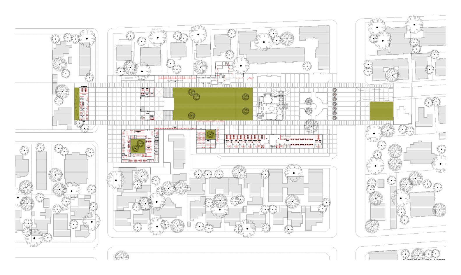 El contexto urbano donde se emplaza el proyecto, y los criterios esbozados con anterioridad, definen lineamientos que intentan liberar y despejar el centro de la manzana, constituyendo una serie de plazas parques en el interior. Para ello, el proyecto opta por perimetralizar los edificios, constituir un borde con usos públicos, que apoyen este nuevo espacio.