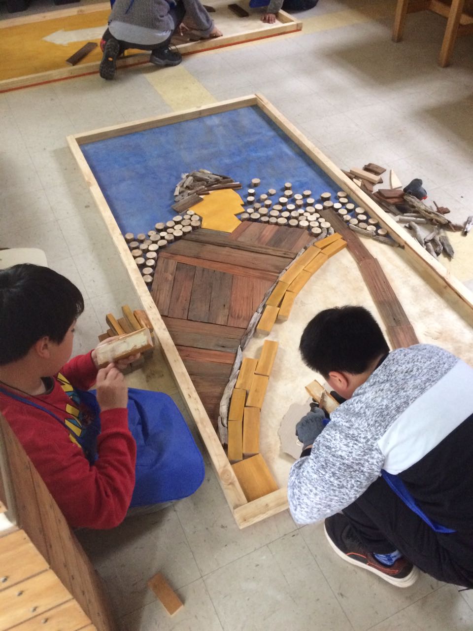 En base a estos elementos se diseñaos tres paneles: uno representando al oficio del hombre del mar, un segundo con la imagen dual de Ten Ten y Cai Cai Vilú como mito fundador del archipiélago, y un tercero con una iglesia chilota en una escena rural. Cada panel tiene la dimensión de 2,44 x 1,22 mts y un peso que bordea los 70 kilos. En ellos se utilizaron tejuelas y maderas recicladas, como el alerce y el ciprés, donadas por los socios del Museo de Chonchi y maderas nativas como el mañío, canelo, tepa, ciruelillo y tineo, siendo los niños y niñas participantes capacitados por las facilitadoras para el manejo de herramientas manuales y eléctricas usualmente utilizadas en el oficio de la carpintería.