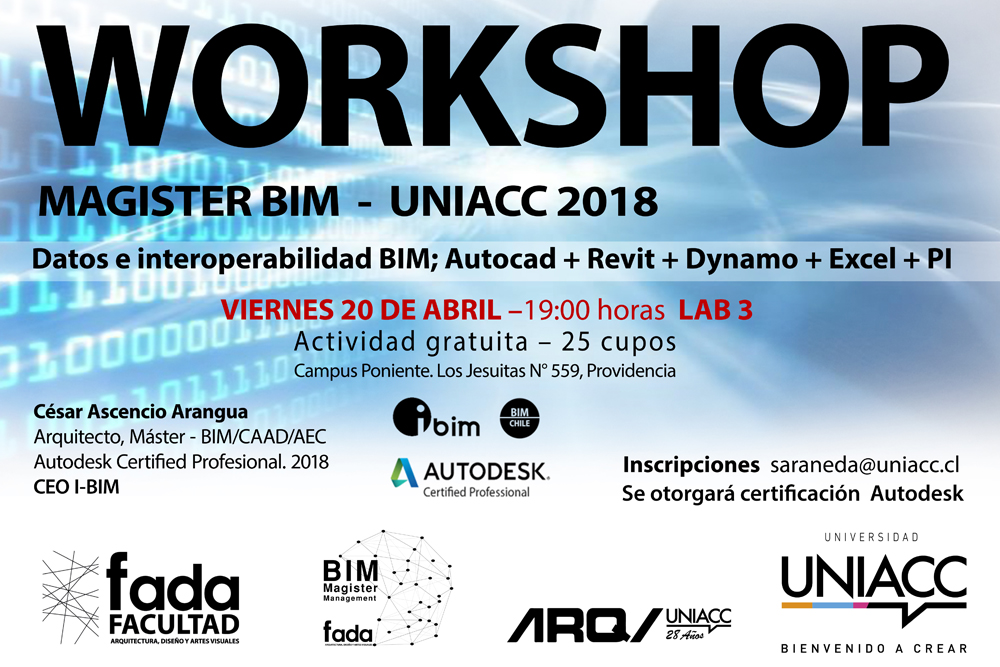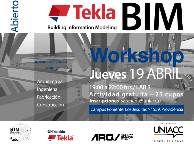 Comienza el jueves 19 de abril a las 19.00hrs, con la introducción a TEKLA estructural de Trimble, con el Profesor Jose Sepúlveda (ir a evento); el viernes 20 de abril a las 19.00 hrs. con la interoperabilidad BIM con la certificación del workshop por AUTODESK con el profesor Cesar Ascencio (ir a evento) y el jueves 26 de abril con la inducción a la fabricación digital en Router y Laser, con el Profesor Jose Barrientos diseñador industrial (evento será publicado).