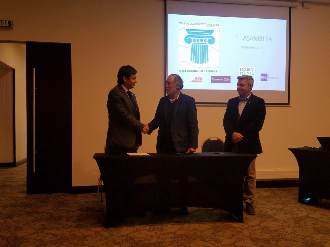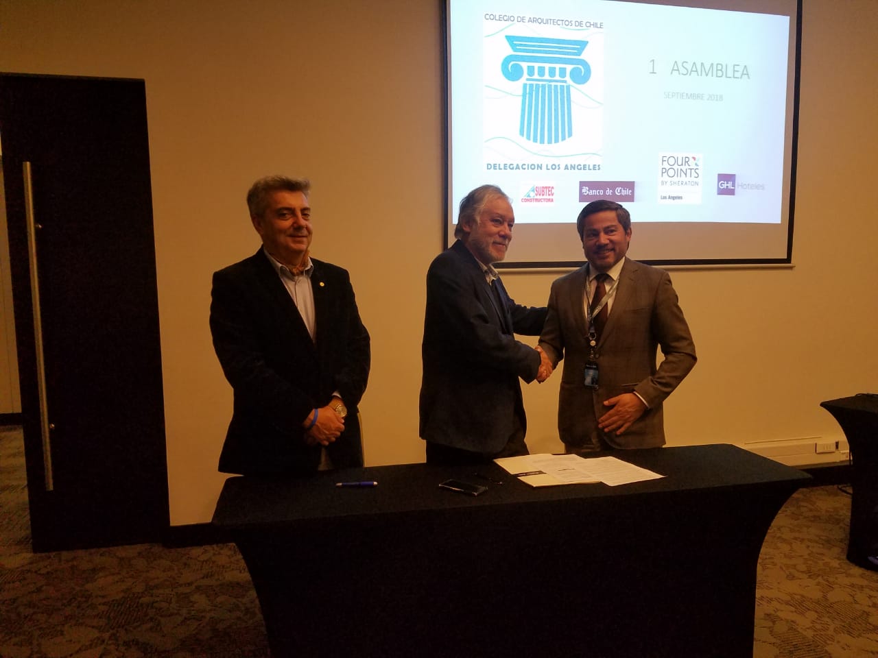 El miércoles 26 de septiembre, en el marco de la asamblea realizada por la Delegación Zonal de Los Ángeles en el Hotel Four Points de Los Ángeles, el Presidente nacional del Colegio de Arquitectos de Chile, Humberto Eliash, firmó dos importantes convenios que irán en beneficio directo de todos nuestros colegiados.