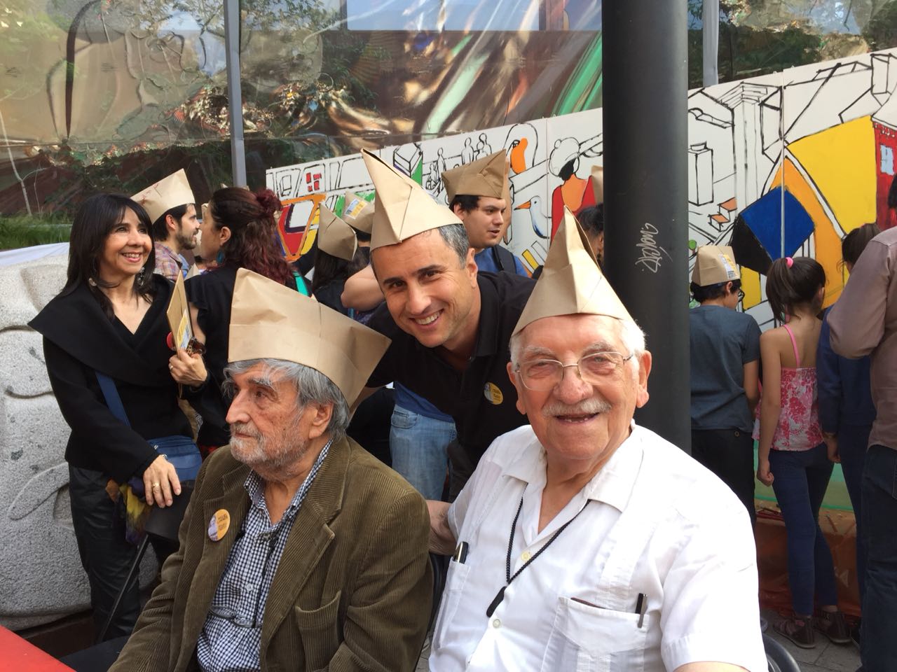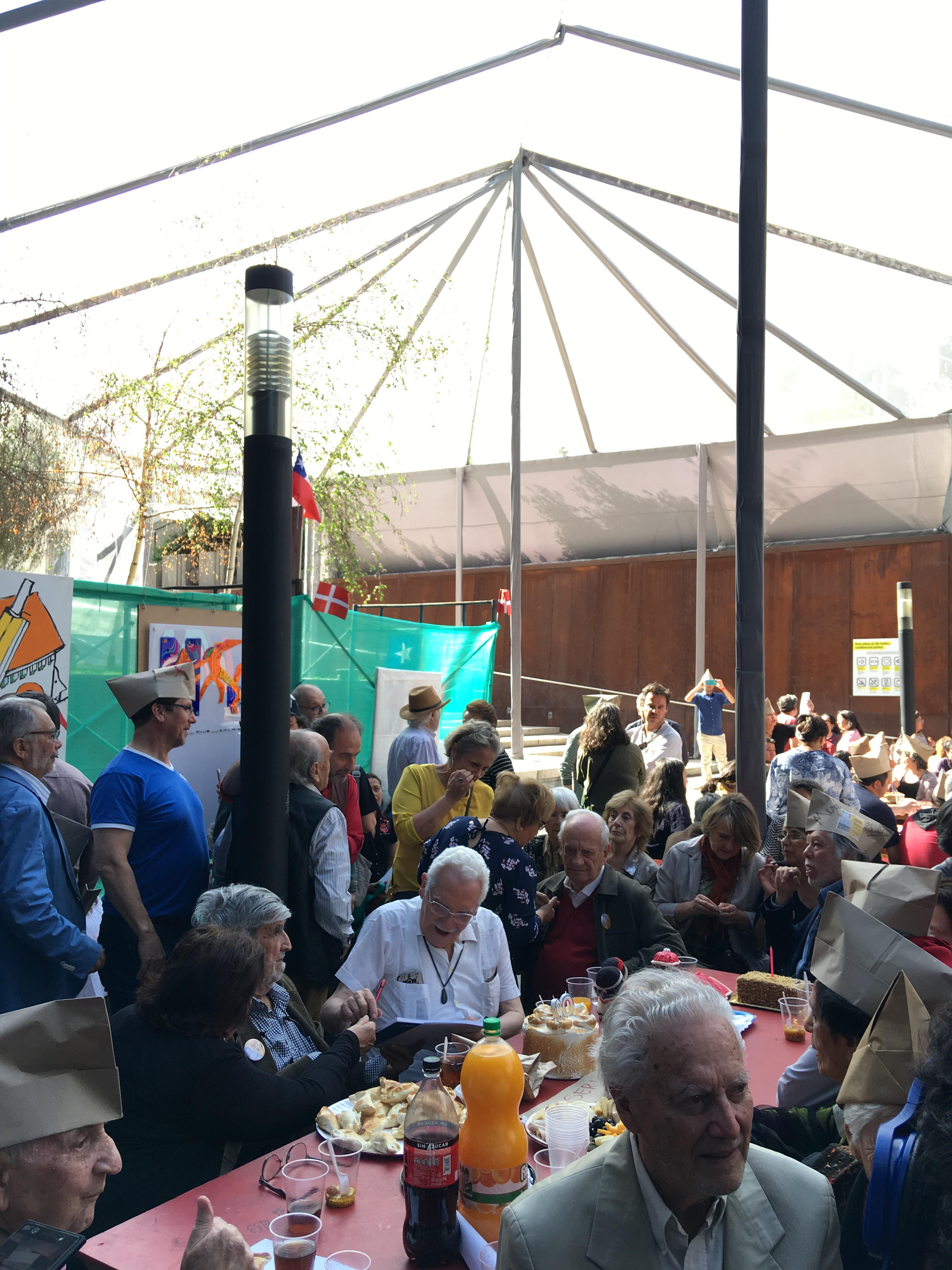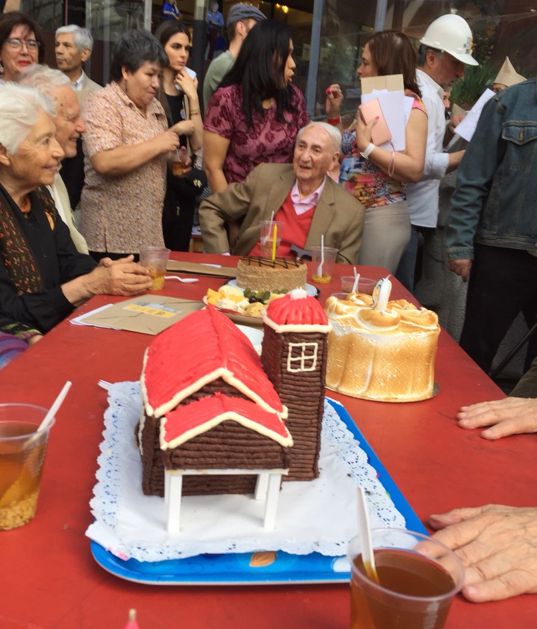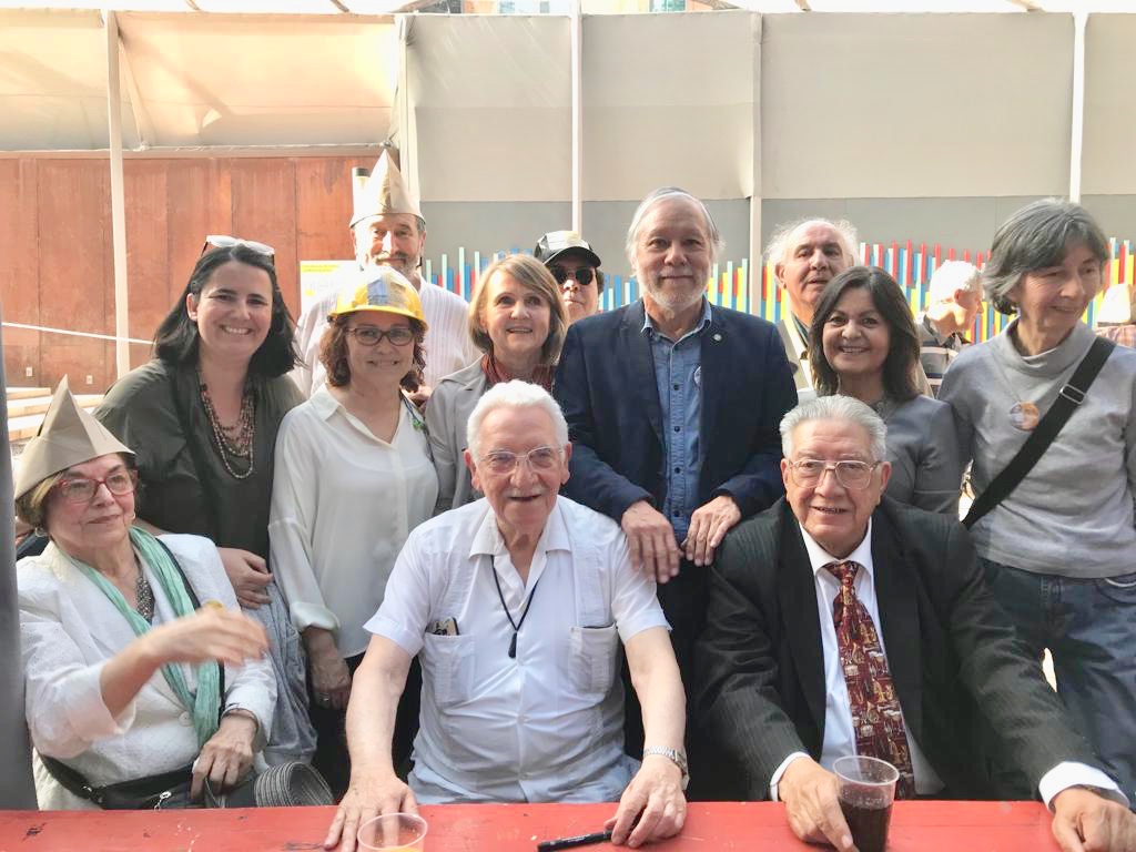 Luego, los asistentes bajaron a la Plaza Zócalo, donde los esperaban largas mesas y 90 tortas para celebrar los 90 años de Miguel Lawner. La celebración, fue al estilo de los tijerales de la UNCTAD III, una fiesta popular con empanadas, mote con huesillos y música para el arquitecto.