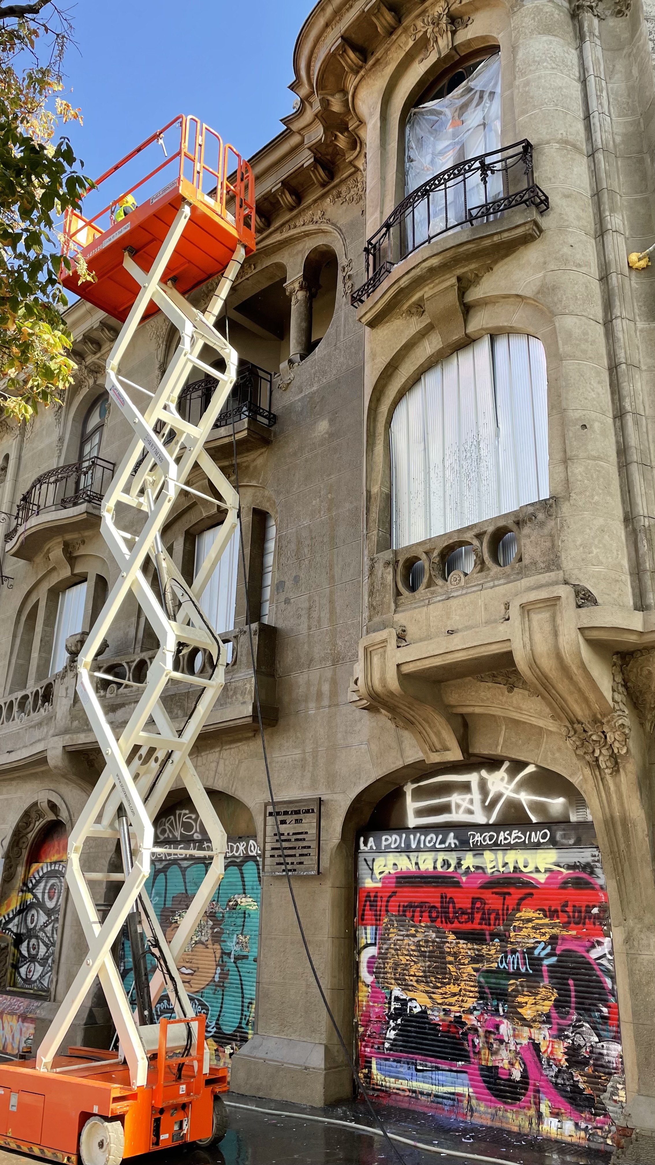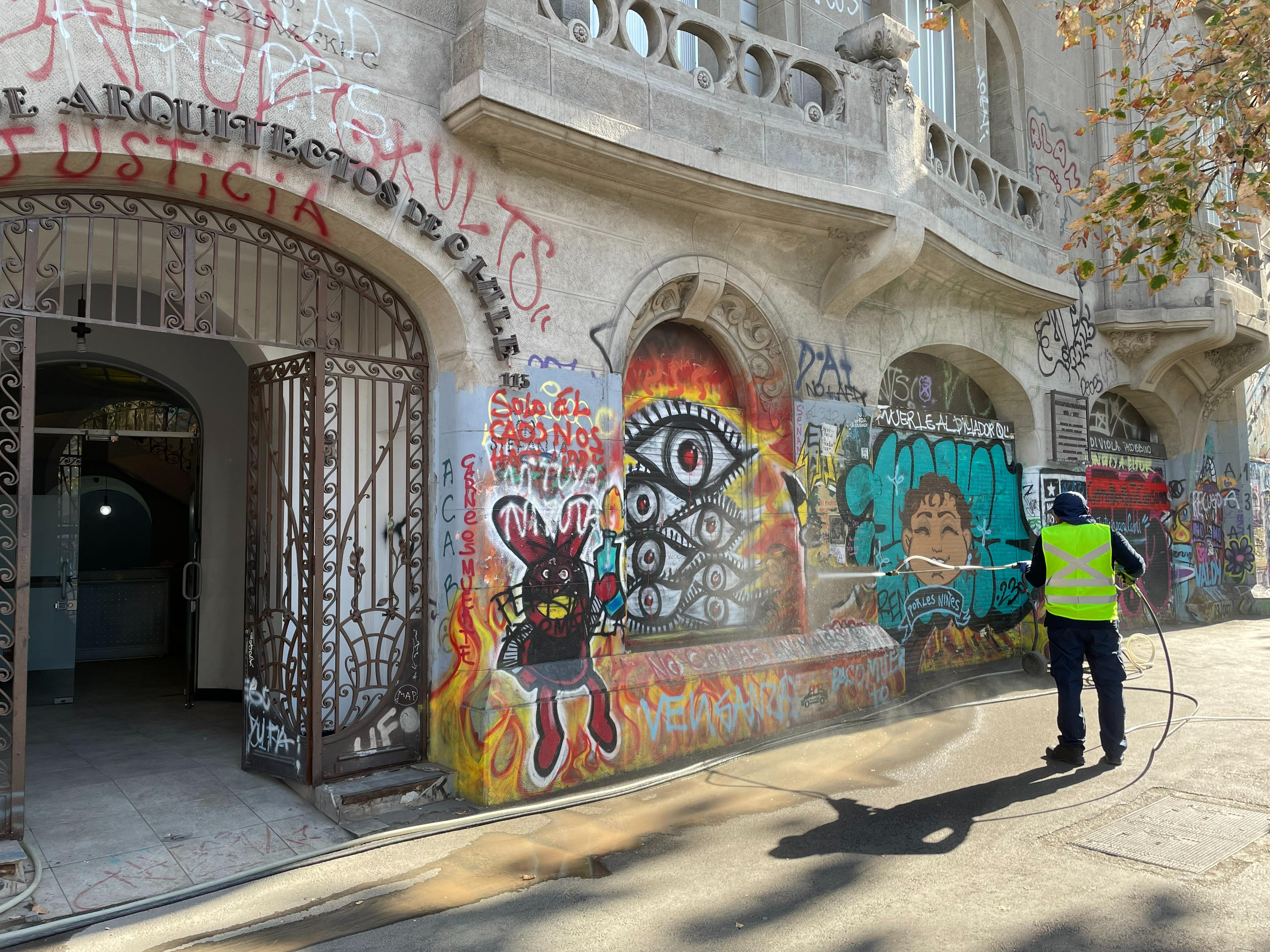 Este lunes 27 de marzo desde las 11. 00 horas comenzaron los trabajos de limpieza en la fachada de la Sede Nacional «Gonzalo Mardones Restat» del Colegio de Arquitectos de Chile, en el marco del Plan de Revitalización de Fachadas del Eje Alameda- Providencia, liderado por el Gobierno Regional Metropolitano de Santiago.