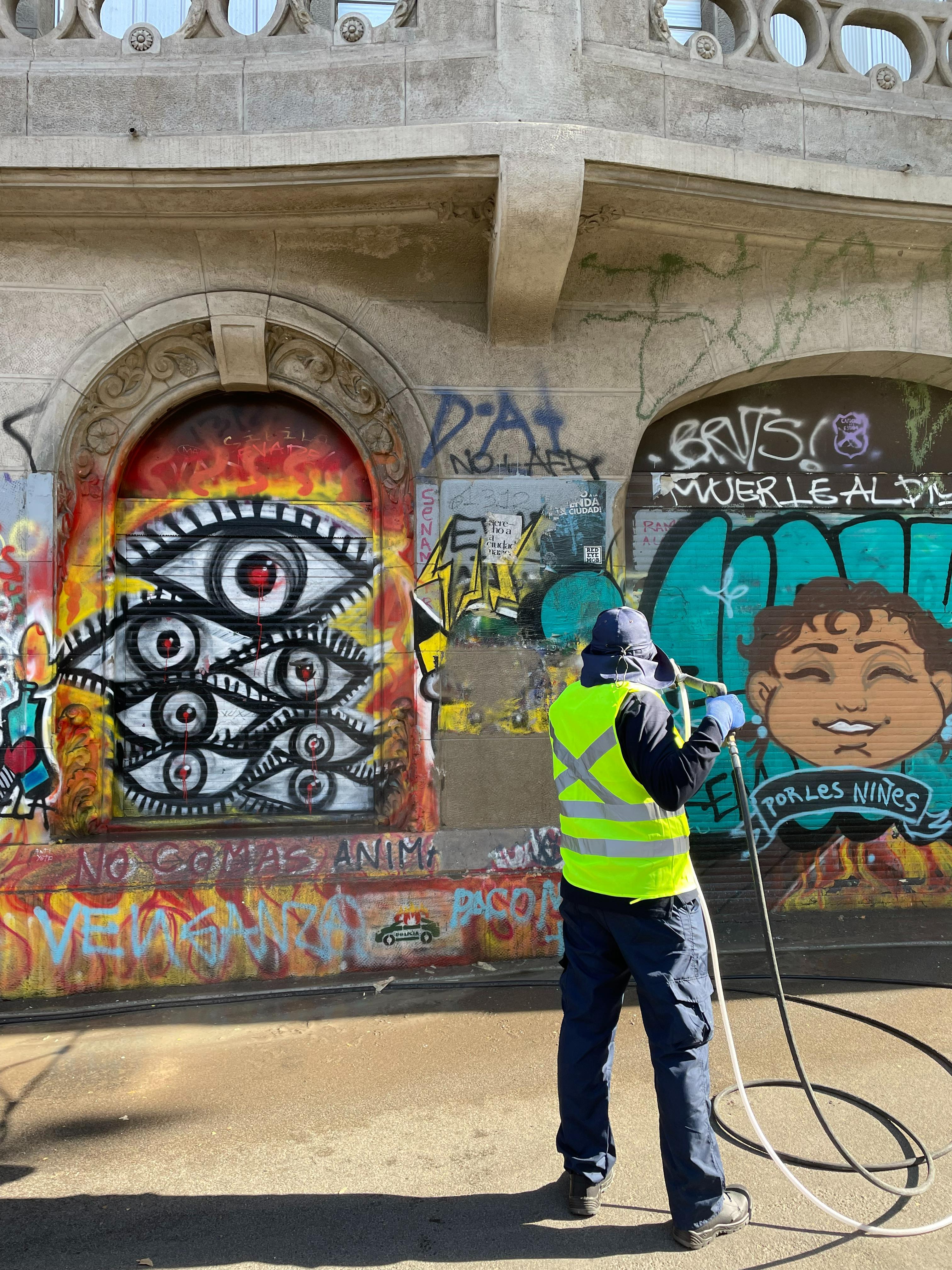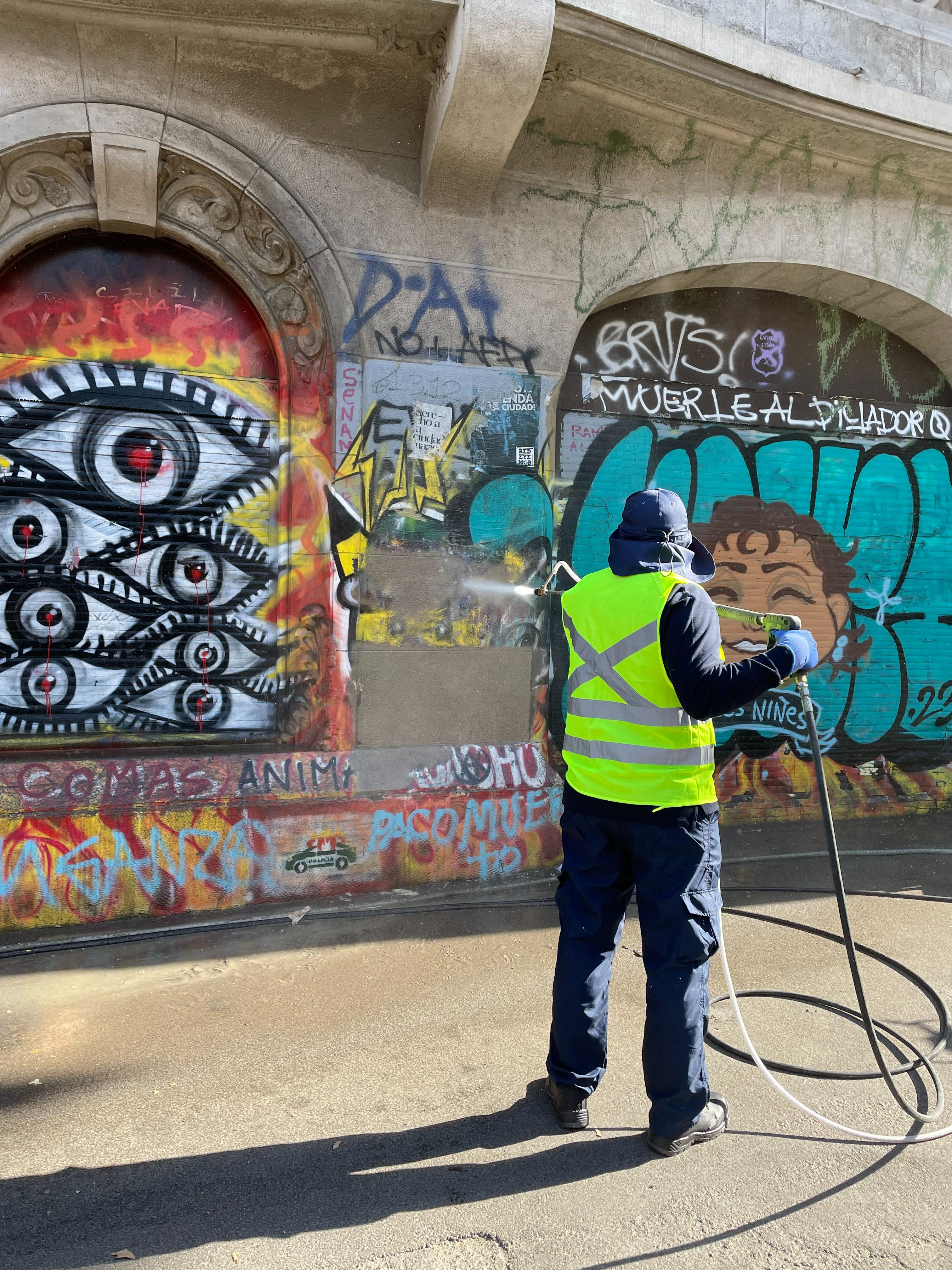 La técnica de limpieza de hidroarenado consiste en la aplicación de agua y arena microtamizada en alta presión, para remover capas de pintura, rayados de aerosoles y rotuladores, contaminación urbana y orgánica, sin dañar la superficie de estuco original.