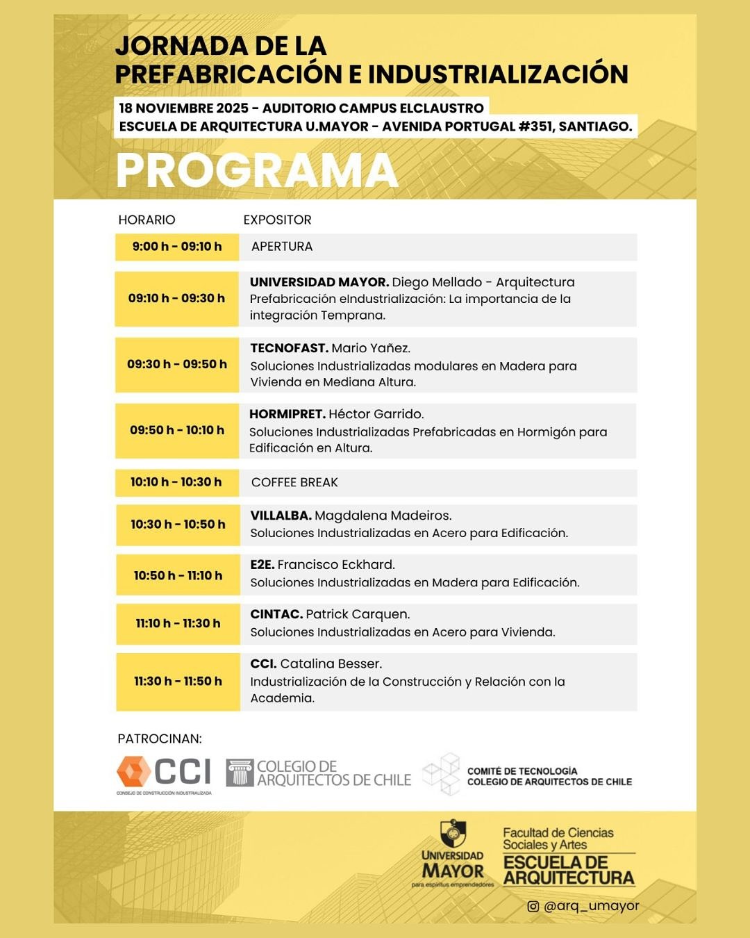El encuentro cuenta con el patrocinio del Colegio de Arquitectos de Chile, el Consejo de Construcción Industrializada (CCI) y la Escuela de Arquitectura de la Universidad Mayor. Una instancia clave para seguir impulsando la transformación sostenible del sector y fortalecer la colaboración entre academia, industria y profesionales del país.