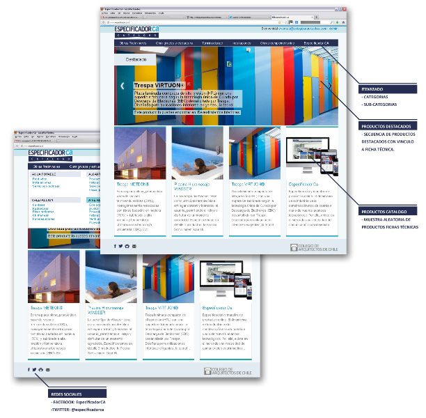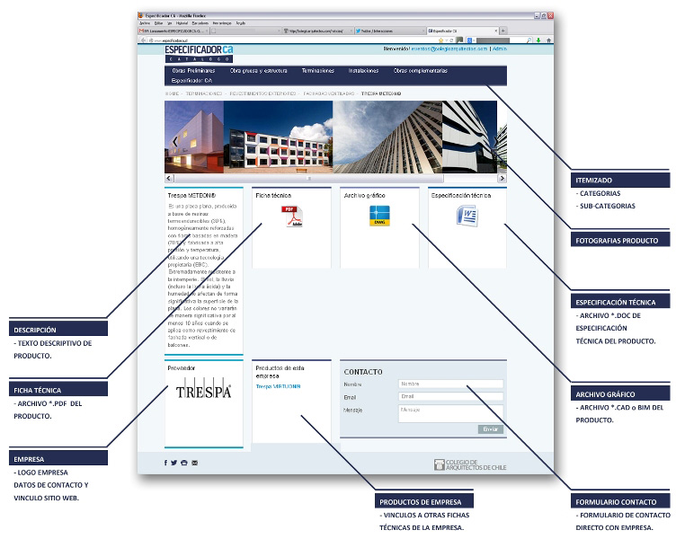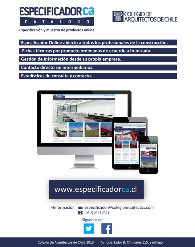 Nuestro ESPECIFICADOR CA permitirá a los arquitectos contar con la información técnica, la especificación propuesta por la empresa, los detalles constructivos para incorporarlos en su planimetría, galería de fotografías además de un contacto directo con los propios especificadores de las empresas lo que facilitará una comunicación fluida, oportuna y directa.