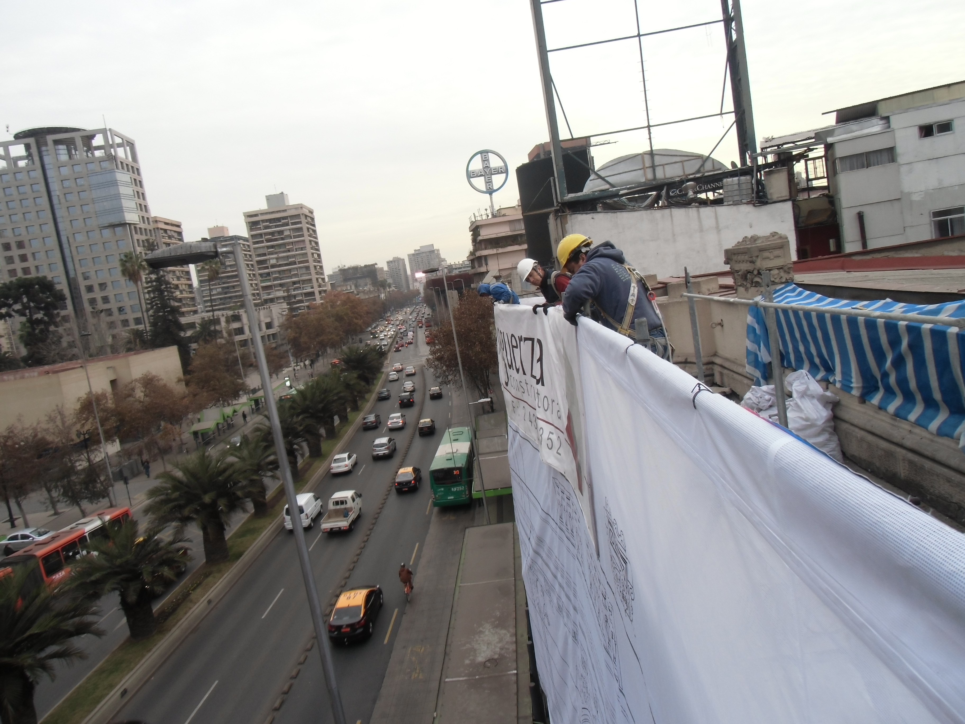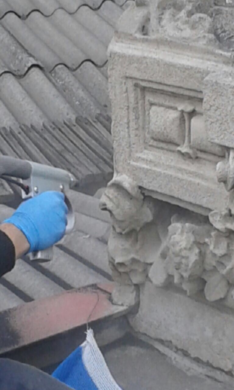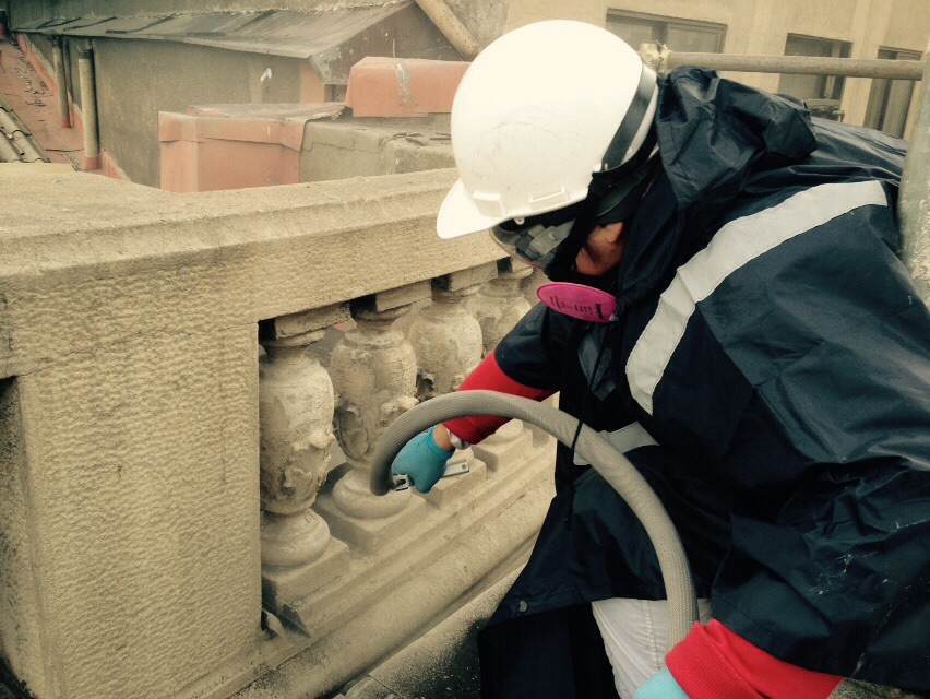 En tanto, los trabajos de recuperación del revoco original mediante microproyección a presión controlada de abrasivos, partieron por la balaustrada del último piso, lo que está por concluirse, para continuar con el tercer piso y luego las dos primeras plantas. A nivel de balaustrada también está ejecución la microinyección de fisuras propias del revestimiento original.