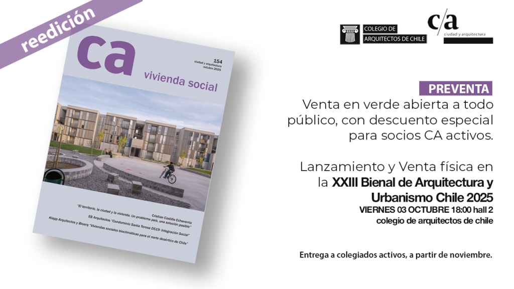 El próximo viernes 3 de octubre a las 18.00 horas en la Sede Nacional del Colegio de Arquitectos de Chile se realizará el lanzamiento de la Revista CA: vivienda social, en el marco de la XXIII Bienal de Arquitectura y Urbanismo de Chile | Doble exposición.